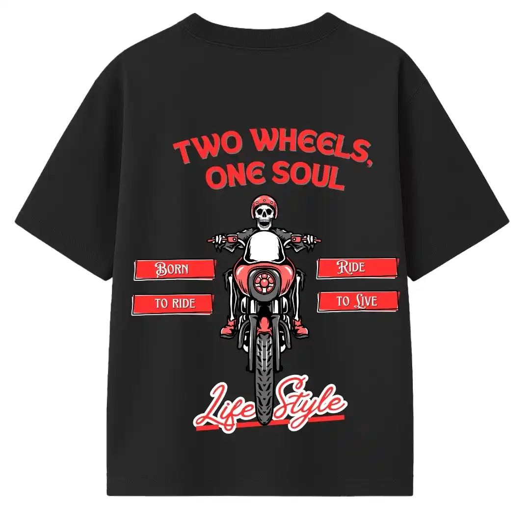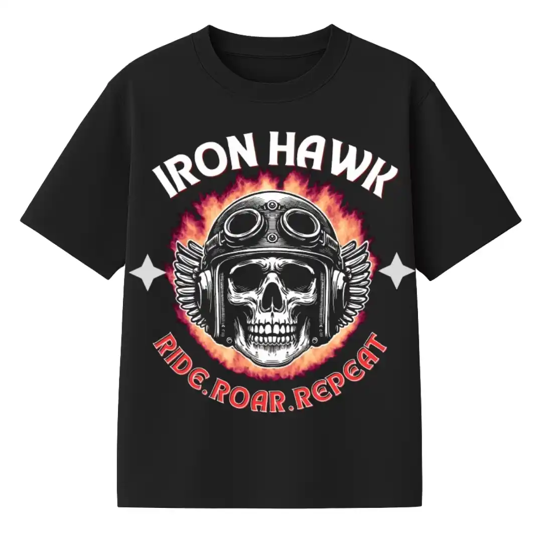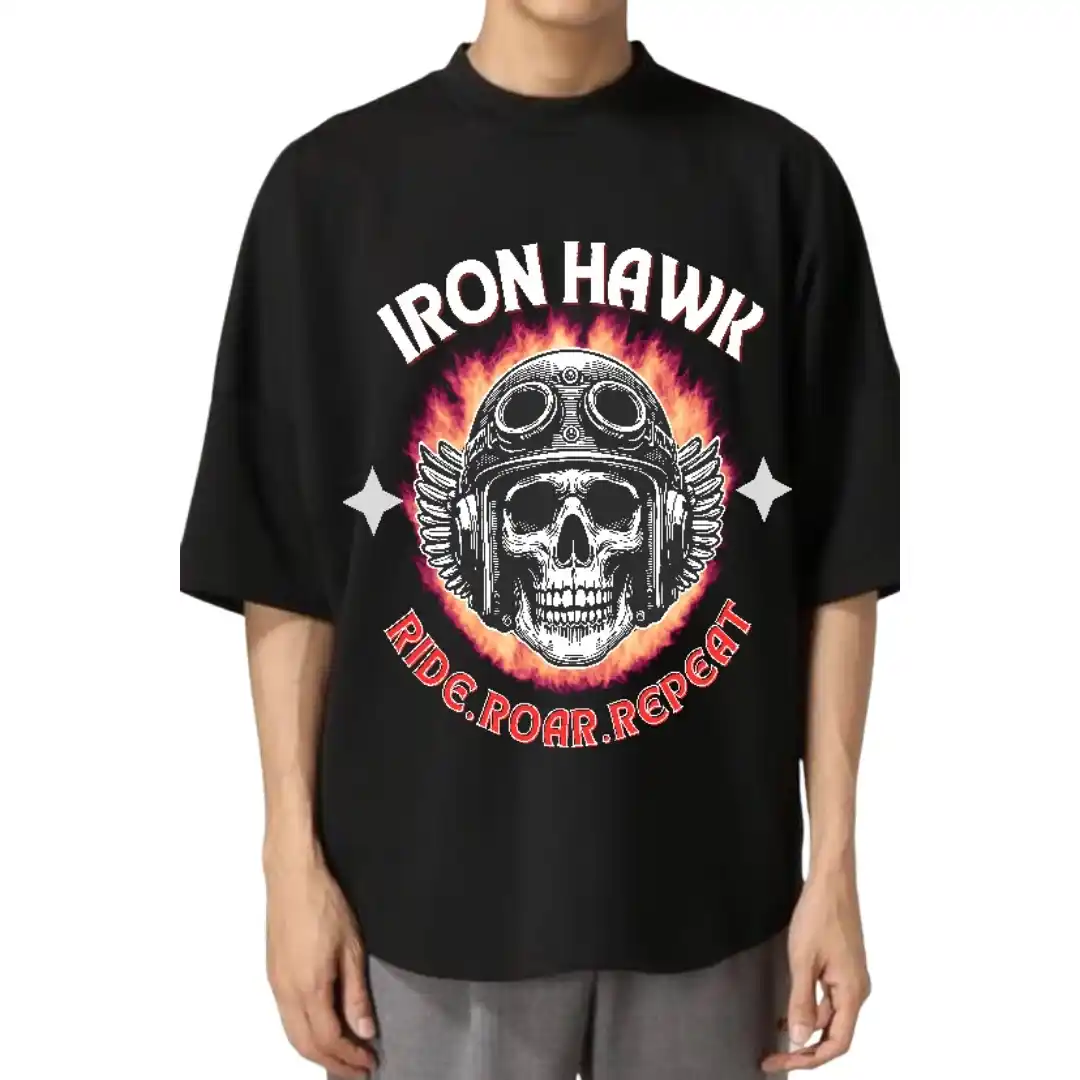 Unleash your inner rebel with the Iron Hawk oversized t-shirt, made for true road warriors. Featuring a bold skull-in-helmet front graphic with the motto “Ride. Roar. Repeat” and a striking back design of a skeleton biker with “Two Wheels, One Soul”—this tee screams freedom and raw attitude. Crafted from premium cotton for all-day comfort and street-style edge.