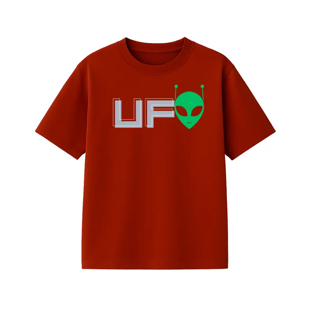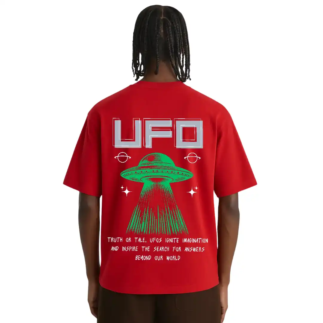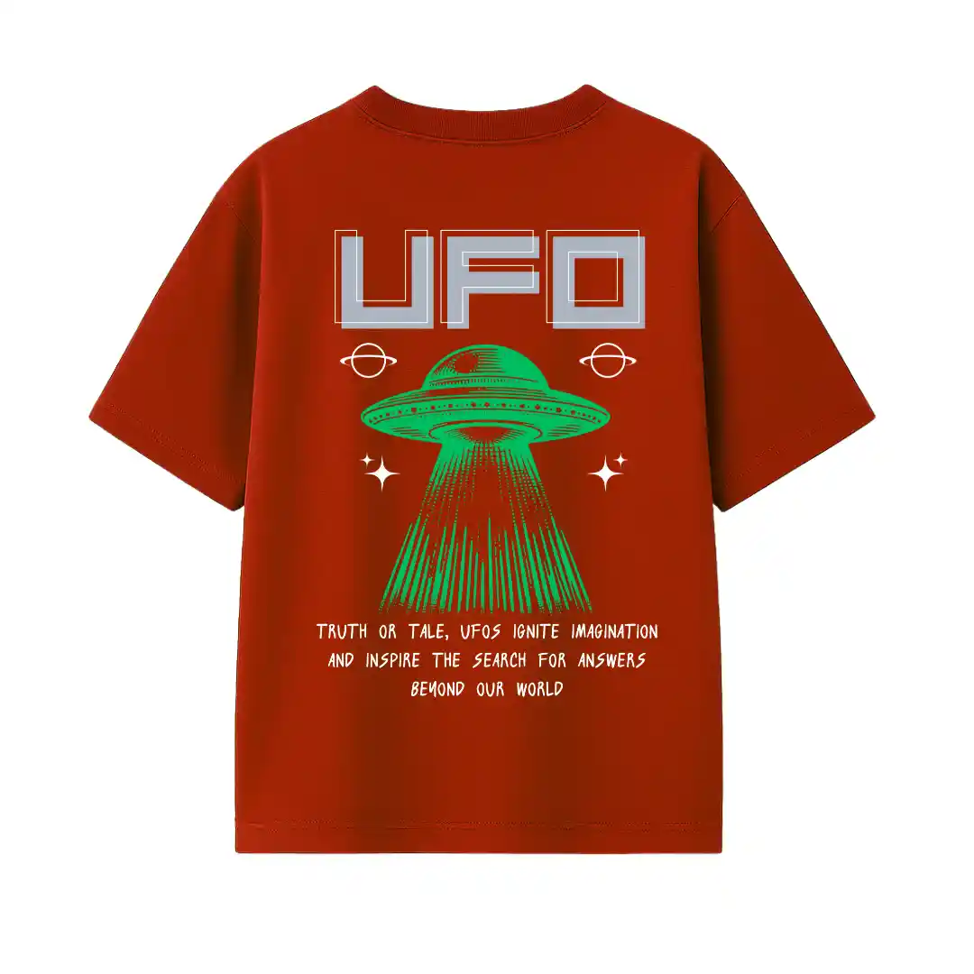 Level up your streetwear with this maroon oversized tee featuring a bold green alien and “UFO” front print. The back brings retro sci-fi vibes with a beaming UFO and a quote that sparks curiosity. Soft, breathable, and made for space lovers and style seekers